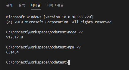 아래와 같이 터미널에서 [node -v], [npm -v] 명령어를 입력했을때 아래와 같이 출력되면 정상