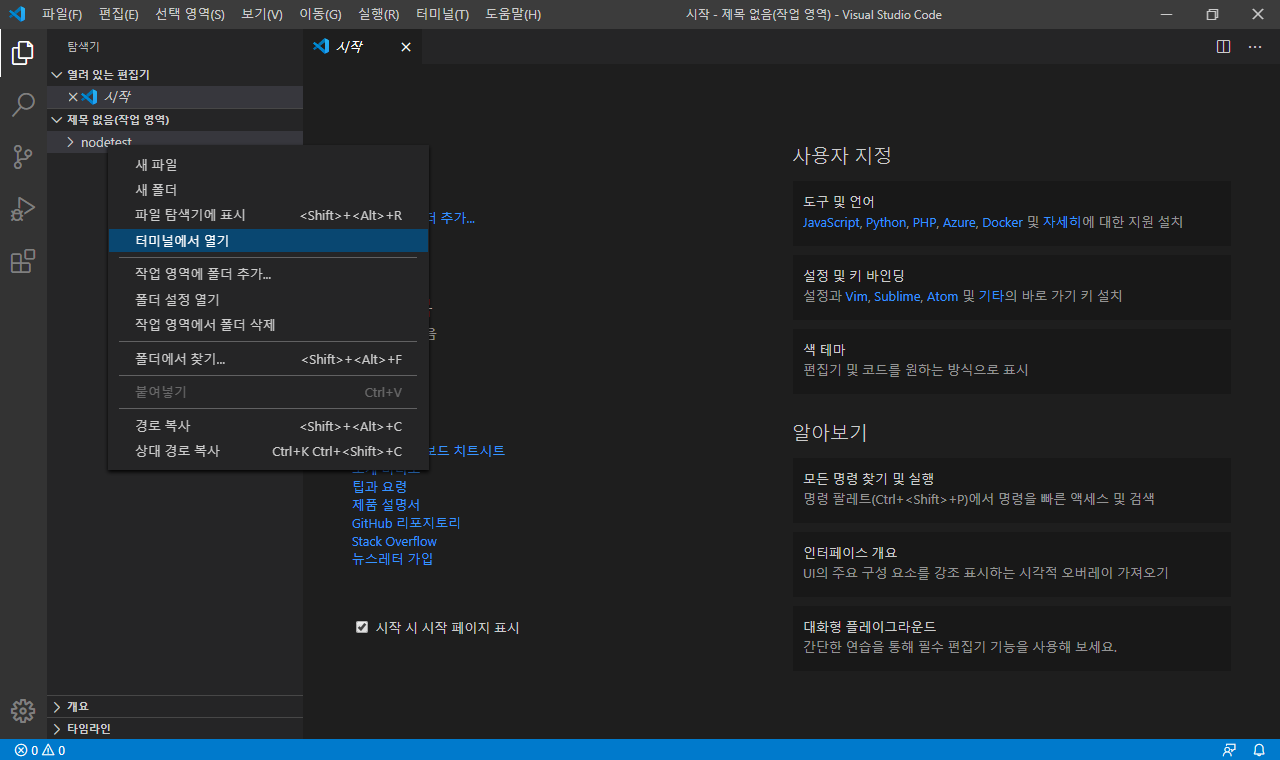 [파일] - [작업영역에 폴더 추가] 한 후 터미널로 해당 작업폴더에 접근한다.